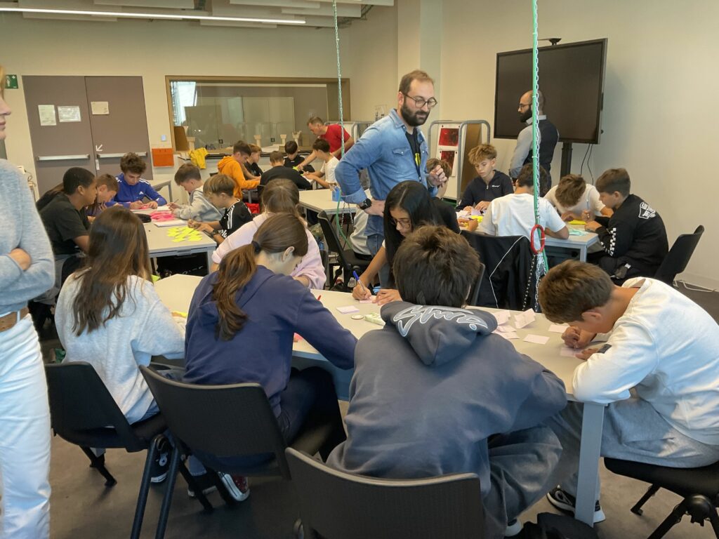 The CO-SPACE contains mobile seats and tables for circa 24 people. It is organised for modular usage, e.g., tables can be moved away and soft seats can replace them for collaborative group or class activities.